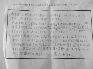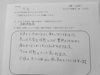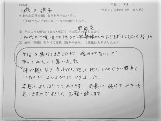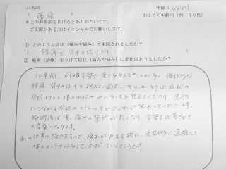 ある日突然ぎっくり腰になりビックリ!ショックでした。それで整体を思い出し通院しております。最初腰以外の筋肉をほぐして頂き、骨盤、肩甲骨等、歪み、ズレの矯正もしてくれてすっきり軽くなりました。それに腰に筋肉のつく体操も教えて頂きありがたいです。腰はもうすっかりよくなりました。また4回目の整体が終わった次の日朝歩いて、ん?いつもの歩き方のクセがよくなってる。いつもは重心が外側なのに内側になってる。5回目の時は猫背もだいぶよくなり背筋がピン!生活習慣の姿勢の悪さも整いつつあり、定期的に通院したいと思っております。